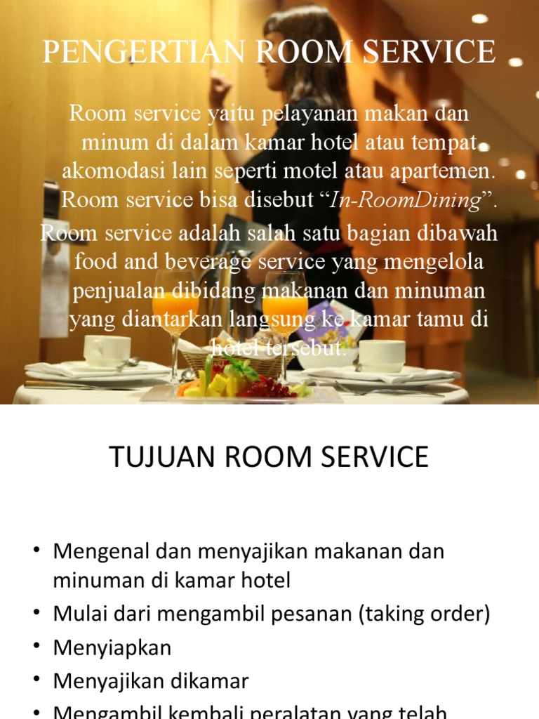 Pengertian Room Service Meliputi Tujuan Ciri Dan Prosedur Pelayanan Pada Room Service Ilmuperhotelan Apa Yang Kamu Cari Ada Di Sin I from 1.bp.blogspot.com Pada pokoknya fungsi room service sama dan sejalan dengan restaurant dan bar. Untuk versi terbarunya 4.6 dan baru saja diupdate tanggal 2 maret 2020. Service charge atau biaya pelayanan adalah suatu komponen yang menjadi satu kesatuan dengan harga produk layanan tertentu pada transaksi penjualan di hotel. Hal ini telah menyebar di semua lapisan kehidupan mulai dari hotel, restoran, kantin industri, kantin rumah sakit, kereta api, saluran udara, semua kini menjadi bagian dari… Selain itu, tujuan lainnya adalah mengecek laundry tamu, mengecek kamar yang ada tanda service dan dnd dan sebagai laporan untuk room discrepancy 7. Hasil pengecekan fisik ini akan dilaporkan ke floor supervisor sabagai laporan morning housekeeping report setelah dikumpulkan dari semua room attendant yang bertugas. Yang membedakan kalau di hotel pemesanan makanan/minuman dilakukan via telpon atau door knop menu sementara kalau di restoran pemesanan bisa dilakukan secara langsung. Bar pada umumnya buka mulai jam 10.00 pagi sampai jam 01.00 lewat tengah malam, tergantung pada fungsi maupun lokasi bar tersebut.